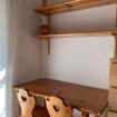 The living area includes a fully equipped kitchenette, a dining table, two comfortable armchairs, and a sofa bed (Please note: the sofa bed will not be prepared for your arrival, as we believe it is fair for you to use the sofa during non-sleep hours. You will find sheets, pillows, and blankets in the wardrobe/shelf closest to the sofa.) The space is enhanced by a stone fireplace, perfect for warming up winter evenings and creating a magical and cozy atmosphere. From the large French window, you can access the private terrace, offering a stunning view of the village houses and surrounding mountains.