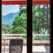 The living room overlooks the spacious terrace, furnished with table and chairs for outdoor dining in nice weather, and admiring the nature that lushly surrounds the building.