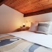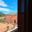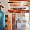 Upon entering, you are welcomed into the living area, which includes a compact yet functional kitchenette and a cozy lounge area, furnished with two comfortable sofas and a TV—perfect for relaxing after a day of exploration. Vintage items on the shelves, wooden accents, and classic décor create a rustic and authentic atmosphere that reflects the charm of the local culture. A French door opens onto a small private terrace—ideal for outdoor dining while enjoying the panoramic view of the bell tower and the green valley below. The double bed is located on a mezzanine overlooking the living area—an intimate and cozy space accessed via a practical spiral staircase. The bathroom is complete with a shower.