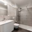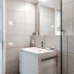The bathroom, designed with a minimalist aesthetic, includes a spacious walk-in shower and modern fixtures.