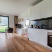 The space, bright and well-organized, ensures a practical and comfortable stay. The open-plan kitchen, fully equipped with modern appliances and kitchen utensils, is designed to meet all your needs. The dining table, placed next to the large French windows, offers a delightful view of the garden and mountains. The environment includes a comfortable double bed, a cozy wooden armchair, a desk, and a smart TV.