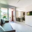 This studio with minimalist furniture and elegant lines welcomes you with an open space living room, divided into a TV area with a sofa to watch a movie after a day of sightseeing, and the dining area with a table for 4 and the modern and complete kitchen, equipped with everything you need to prepare lunches and dinners like at home.