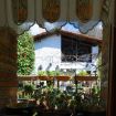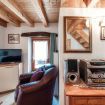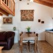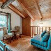 The apartment opens onto a small open-plan living area, featuring a cozy lounge with a sofa and an open kitchen with a dining table. The traditional style and authentic character of the furnishings recall typical mountain chalets, with lace curtains, stone-effect floors, and exposed beams that enhance the ceiling.