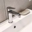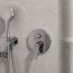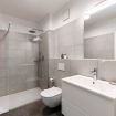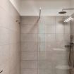 The bathroom, designed with a minimalist aesthetic, includes a spacious walk-in shower and modern fixtures.