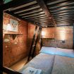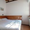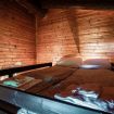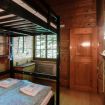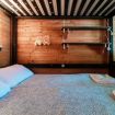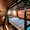 The two bedrooms are wood-paneled, warm and cozy. The first bedroom features a double bed and, without a door, opens directly onto the living area; the second bedroom offers a bunk bed with spacious French-size beds and a beautiful window overlooking the serenity of nature.