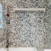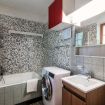 The bathroom, decorated in mosaic, has a bathtub and is equipped with a washing machine.