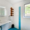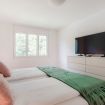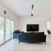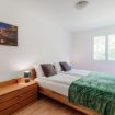 The accommodation features a bright living area with two comfortable sofas and a TV, lit by a large sliding window overlooking the garden and lush surrounding forest. Outside, under the covered patio, guests can relax immersed in the sounds of nature or enjoy pleasant moments around the spacious dining table. The modern kitchen, overlooking the dining area and separated by a breakfast bar with stools, is equipped with the latest appliances and fully stocked for every need. The sleeping area includes three spacious double bedrooms, furnished in a minimalist style with warm wooden accents and large windows that open onto the natural landscape, creating a peaceful and intimate atmosphere. The accommodation also includes two bathrooms—one with a shower and one with a bathtub—offering comfort for all guests.