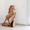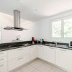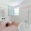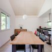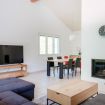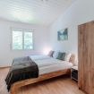 The accommodation features a bright living area with a comfortable sofa and a TV, illuminated by a large sliding window that opens onto the spacious terrace and the lush surrounding forest. Outside, guests can unwind while immersed in the sounds of nature or enjoy pleasant moments around the large dining table provided. The modern kitchen, overlooking the dining area and separated by a breakfast bar with stools, is equipped with state-of-the-art appliances and prepared to meet every need. The sleeping area includes three spacious double bedrooms, furnished in a minimalist style with warm wooden details and large windows that open onto the natural landscape. The sloped wooden ceiling, a key feature of the home’s interior, enhances the sense of peace and intimacy, further emphasized by the soft lighting. The accommodation is completed by two bathrooms—one with a shower and one with a bathtub—designed to meet all guest needs.