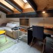 Climbing the stairs you will access the mezzanine floor with exposed beams, and you can sit on the large sofa that becomes a double bed for the night (Please note: The sofa bed will not be prepared as a bed for your arrival, as we deem it proper to use it as a sofa during the day. You will find the bed linen, pillows and blankets in the wardrobe/shelf closest to the sofa.), or manage your work from the desk corner or even watch TV.