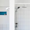 A bathroom with shower completes the apartment.