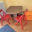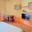 The spacious living room welcomes guests with a comfortable corner double sofa bed, complemented by a footstool pouf, a TV unit, and a wall-mounted dining table ((Please note: the sofa bed is not prepared, we think it is proper to use the sofa during non-sleeping hours. You will find sheets, pillows and blankets in the closet/shelf most adjacent to the sofa). The warm shades of the parquet flooring create a cozy and relaxing atmosphere, enhanced by red and orange decor accents that bring energy and vibrancy to the space. A French door opens onto the furnished terrace with a table for four, from which you can glimpse the sea between the rooftops and trees of the city. The adjacent wooden kitchen is fully equipped with everything needed to cook independently. The bright and well-kept double bedroom offers a large wardrobe with doors to help organize the space efficiently. The bathroom, decorated with a mosaic pattern, is complete with a shower and a washing machine.