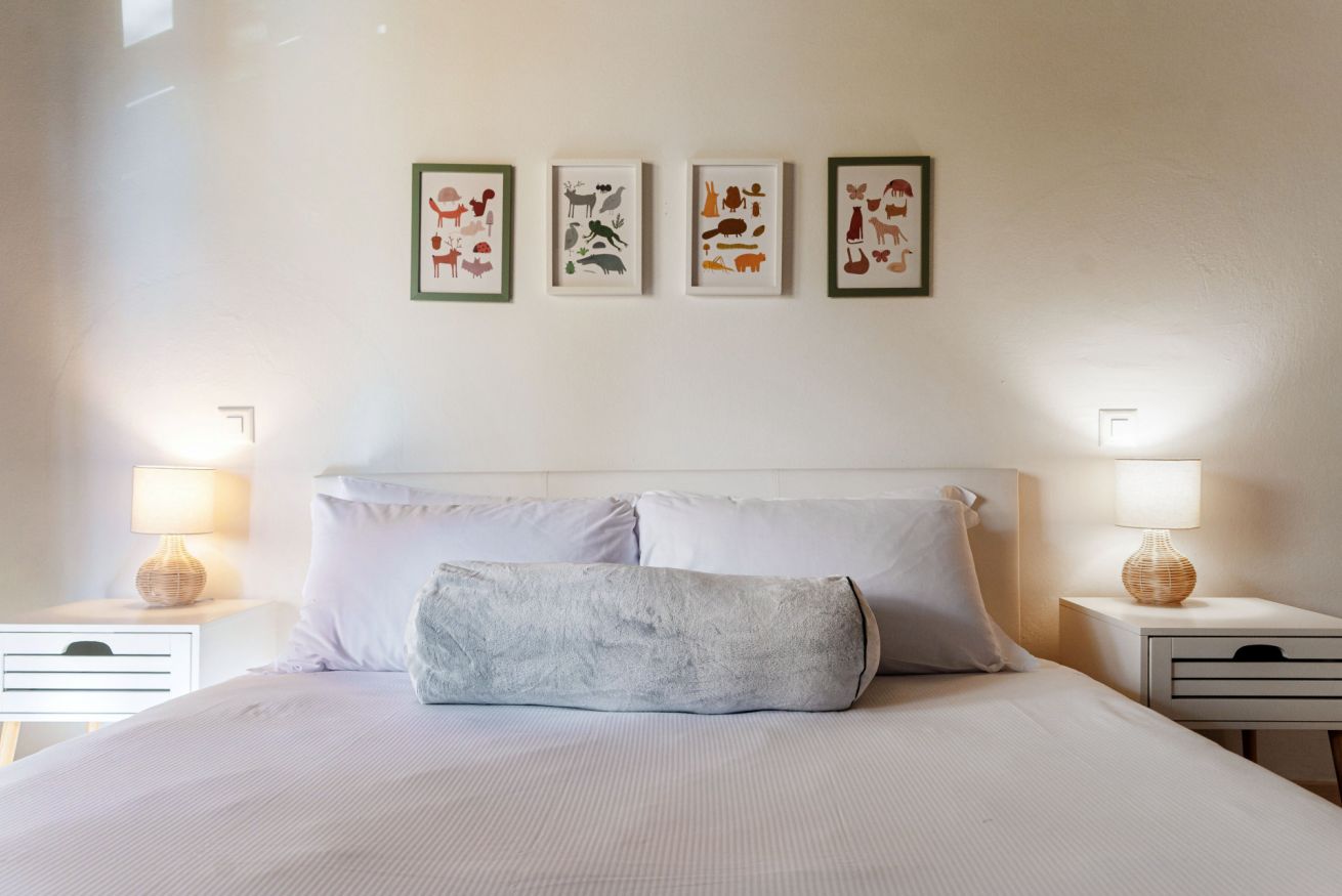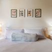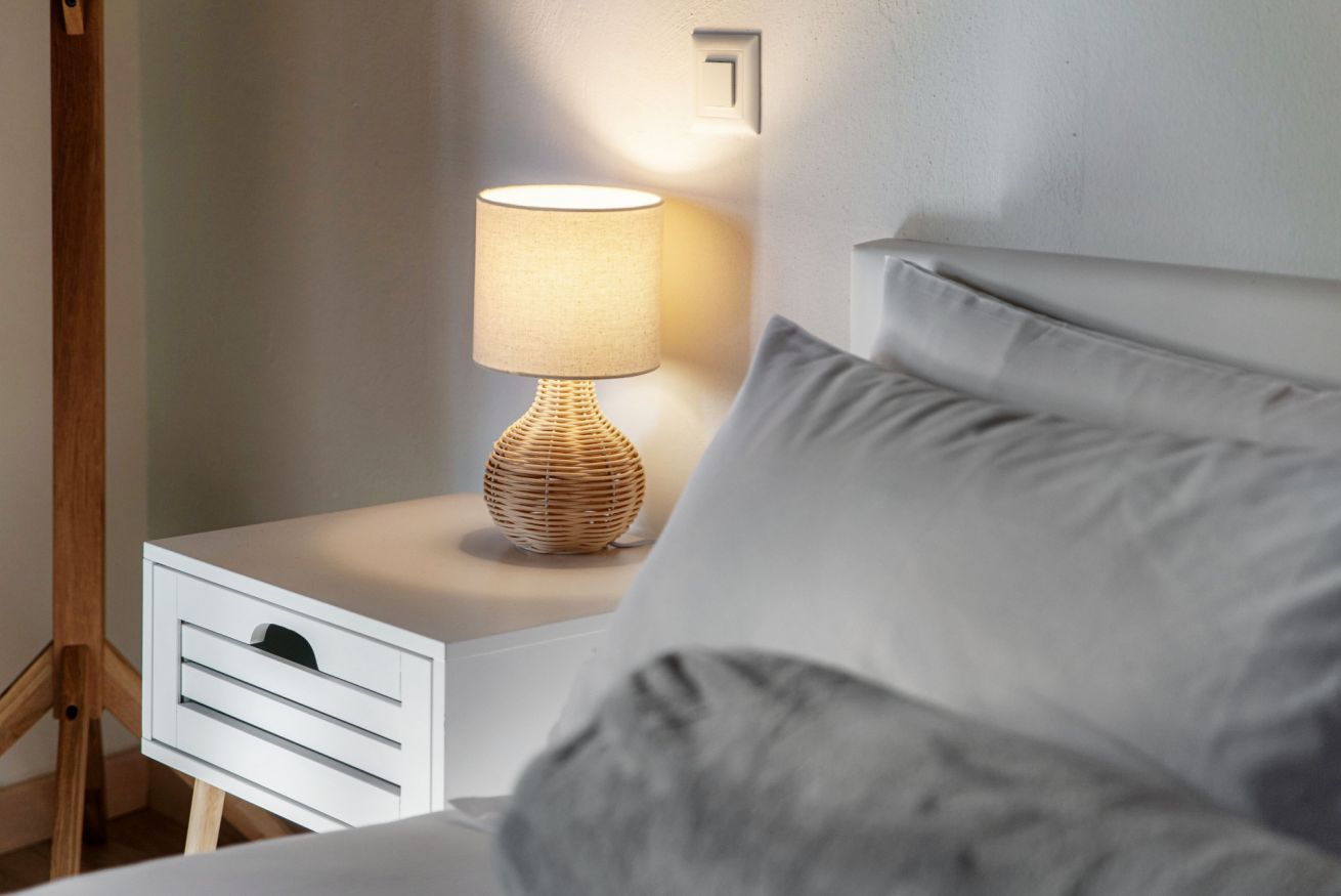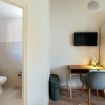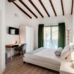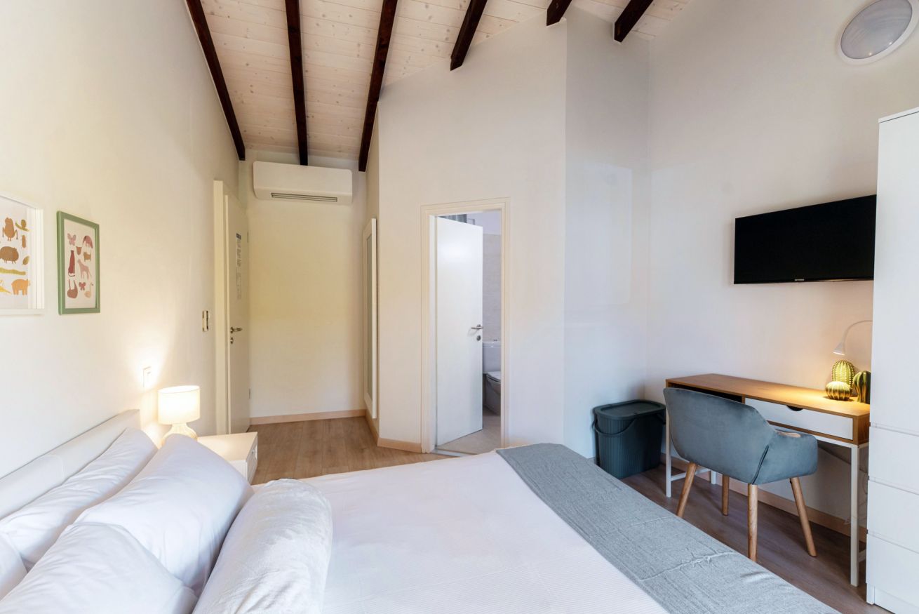 The room, spacious and bright, is furnished in a contemporary style with clean lines and carefully selected details. The comfortable double bed, flanked by two bedside tables with warm, soft lighting, invites you to relax after a day of exploring. A large wardrobe provides ample space for your belongings, while the practical desk with armchair is perfect for working, reading, or simply unwinding. The wall decorations, including small pictures and straw ornaments, add character and create a cozy, harmonious atmosphere.