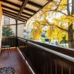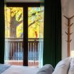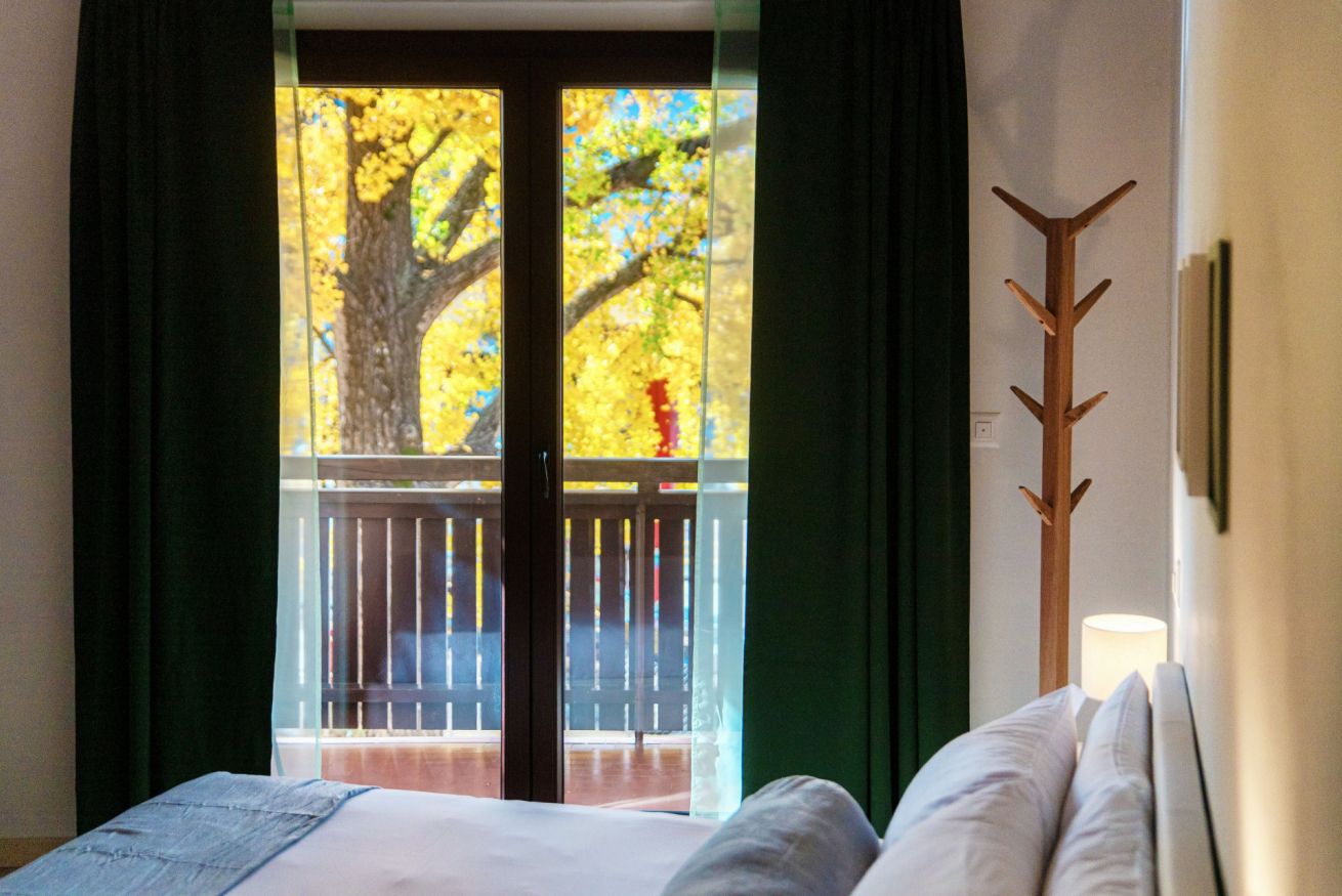 A large glass door opens onto a private balcony, a peaceful spot to enjoy fresh air and the quiet atmosphere of Ascona.