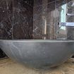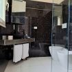 The bathroom, with a modern design, is finished with elegant dark tiles and features a spacious shower and a washing machine, ensuring comfort and practicality.