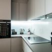 The living room is bright and cosy, with a sofa for reading a book and relaxing after a day of sightseeing. Next to it, the dining area has a round table for 4 people, where you can have lunch and dinner just like at home with the dishes prepared in the modern, fully equipped kitchen with the latest appliances.