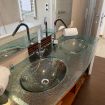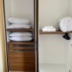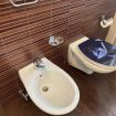 The bathroom, decorated with ceramic-effect tiles in shades of brown, is equipped with a toilet, bidet, shower with hydromassage showerhead and bathtub. It also offers several shelves for organising one's personal belongings. The two washbasins are set into a glass shelf, which gives an original aesthetic effect.