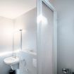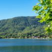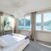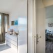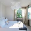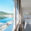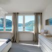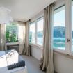 The romantic double bedroom has a very large lake view thanks to the corner window. The bathroom with shower completes the flat.