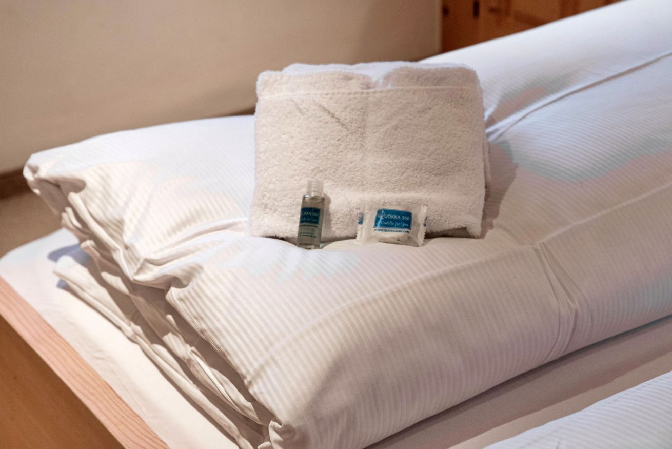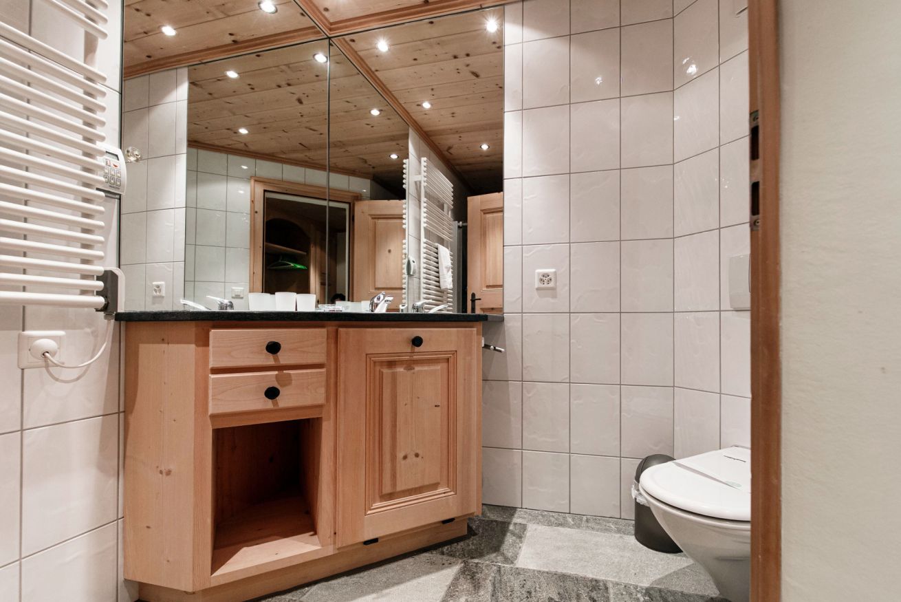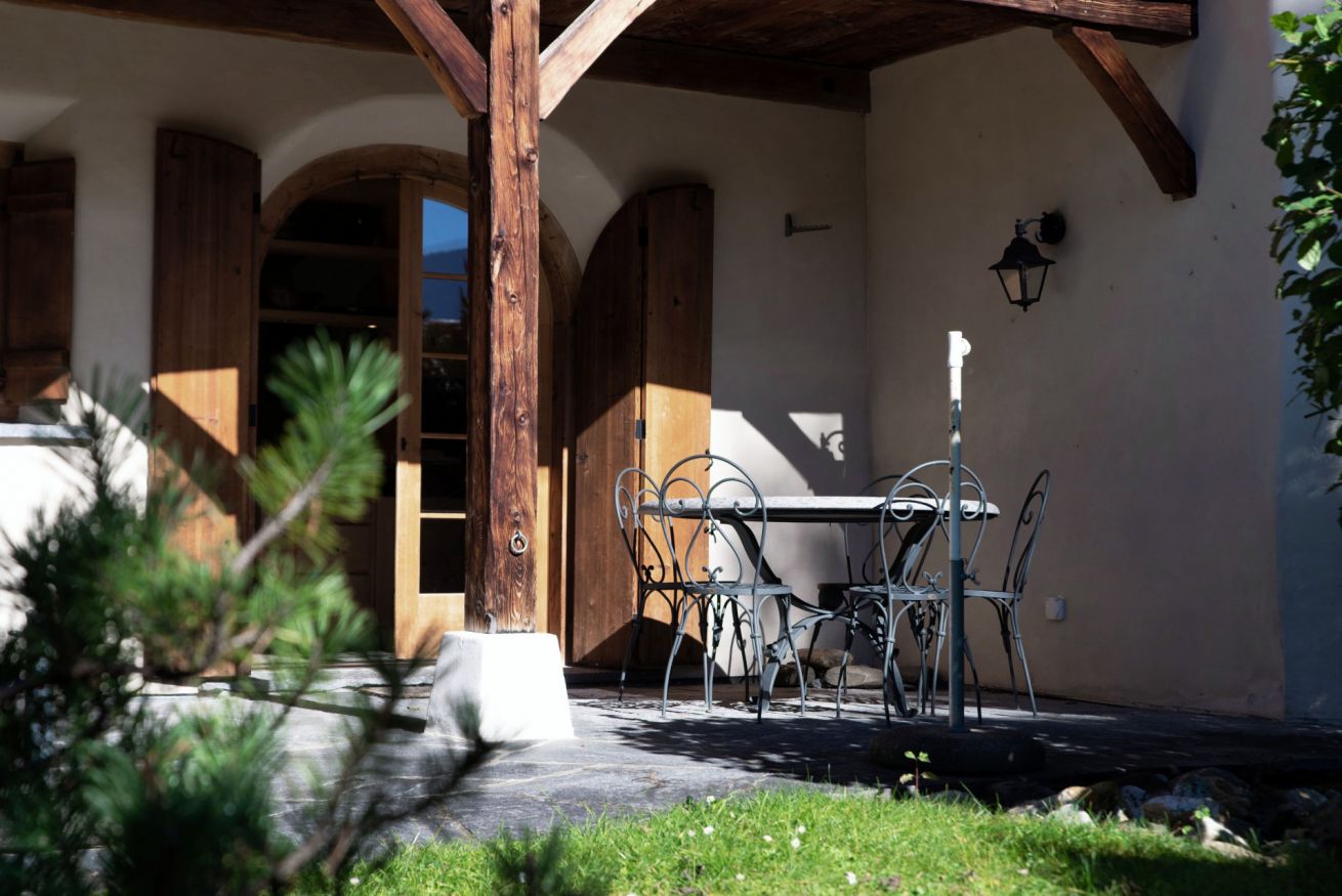 Outside, the private patio offers an ideal space to relax, furnished with a table, chairs, and deck chairs, set in an enchanting natural environment. In winter, the snowy landscape surrounding the residential complex transforms this space into a magical place, perfect for enjoying the tranquility of the Alps.