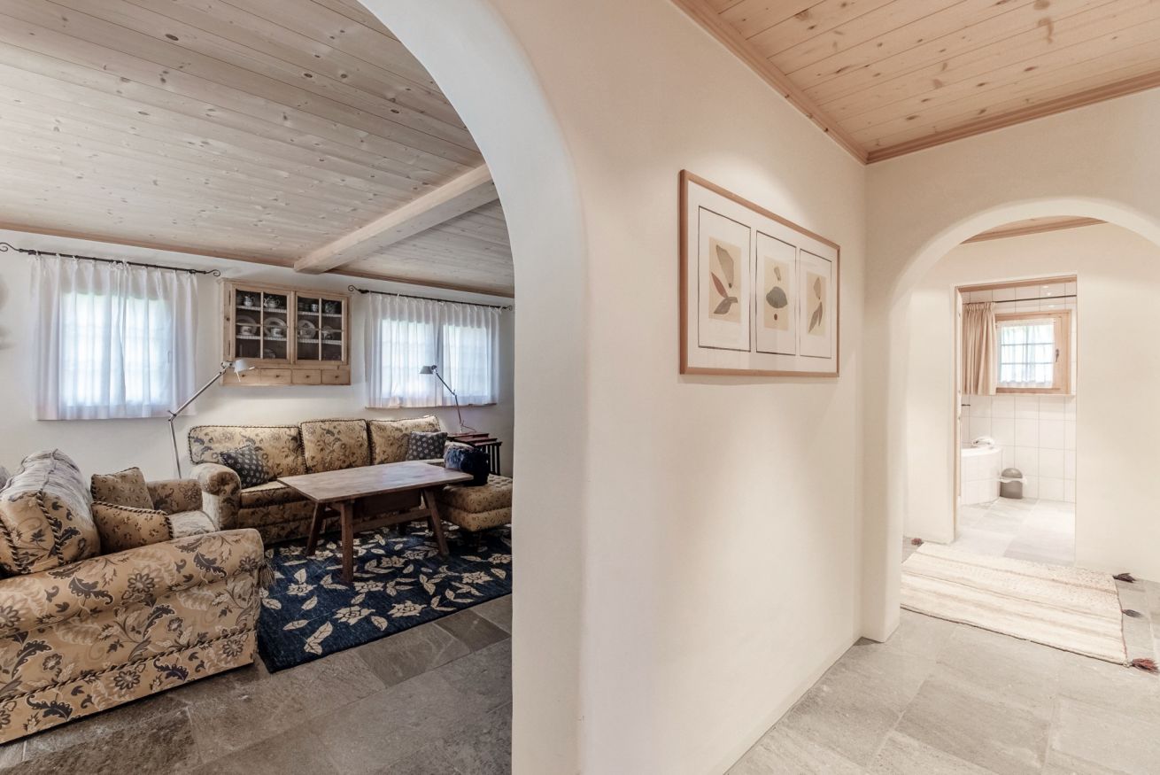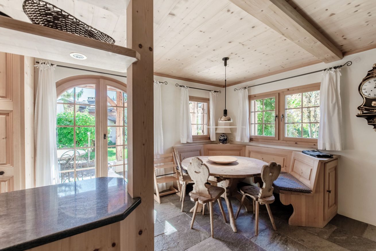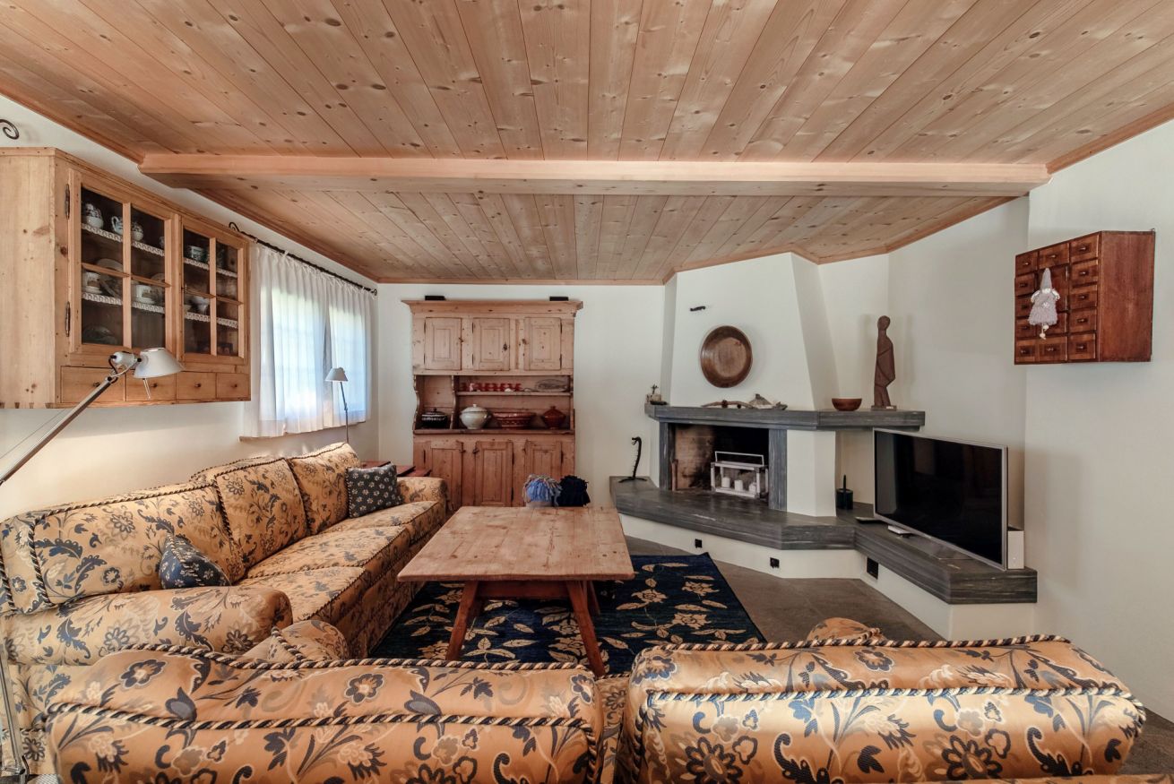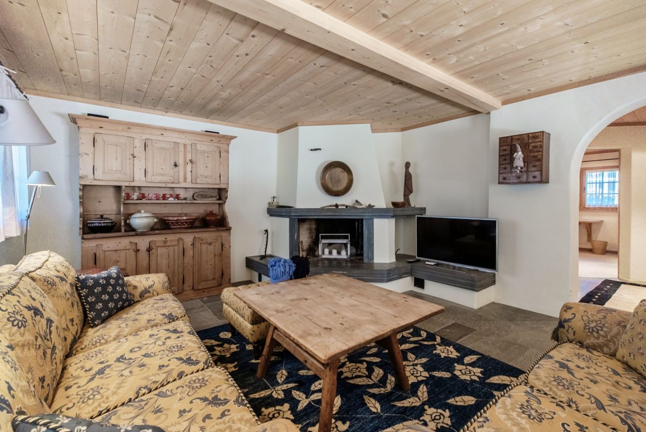 The kitchen is a perfect blend of tradition and modernity. Granite surfaces and wood harmoniously coexist with state-of-the-art appliances, including an oven, dishwasher, and Nespresso coffee machine. It is a well-equipped and functional space, ideal for preparing warm meals after a day spent on the ski slopes or trekking trails. The kitchen opens onto the living room, creating a single environment: the corner table with wooden benches is the perfect place to share meals and stories of the day. The living room features a comfortable sofa adorned with floral fabrics, ideal for resting and reading a book; large windows let in natural light, illuminating the space and offering a stunning view of the surrounding landscape.