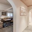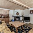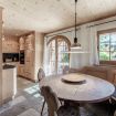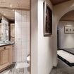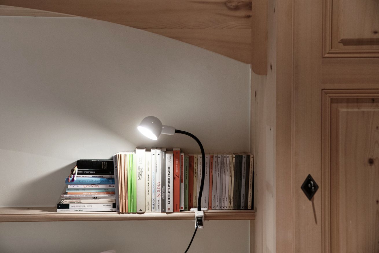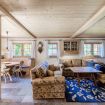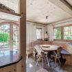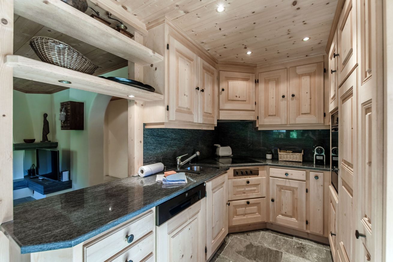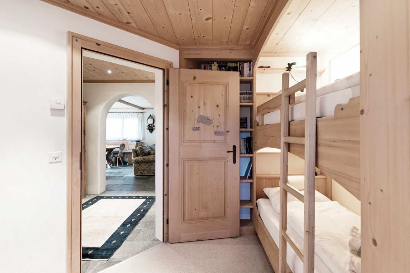 The kitchen is a perfect blend of tradition and modernity. Granite surfaces and wood harmoniously coexist with state-of-the-art appliances, including an oven, dishwasher, and Nespresso coffee machine. It is a well-equipped and functional space, ideal for preparing warm meals after a day spent on the ski slopes or trekking trails. The kitchen opens onto the living room, creating a single environment: the corner table with wooden benches is the perfect place to share meals and stories of the day. The living room features a comfortable sofa adorned with floral fabrics, ideal for resting and reading a book; large windows let in natural light, illuminating the space and offering a stunning view of the surrounding landscape.