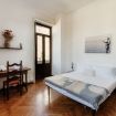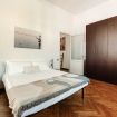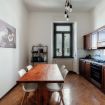 The accommodation welcomes guests into a bright living area where the fully equipped open-plan kitchen blends harmoniously with the convivial space dominated by a large dining table. The wooden classic furnishings and the refined herringbone parquet flooring give the environment a timeless elegance, while maintaining a warm and welcoming atmosphere. The bedroom features a comfortable double bed and a spacious wardrobe with doors, ideal for organizing your wardrobe neatly. In the antechamber preceding the room, a practical sofa bed offers the possibility of accommodating two additional guests (Please note: the sofa bed is not prepared, we think it is proper to use the sofa during non-sleeping hours. You will find sheets, pillows and blankets in the closet/shelf most adjacent to the sofa). Both rooms overlook a charming columned balcony, a typical stylistic element of the era, perfect for admiring picturesque views of the city. Completing the apartment is a practical and functional bathroom with a bathtub and shower.