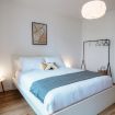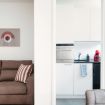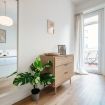 The living room consists of a modern TV area and a comfortable sofa that becomes a double bed for the night (Please note: The sofa bed will not be prepared as a bed for your arrival, as we deem it proper to use it as a sofa during the day. You will find the bed linen, pillows and blankets in the wardrobe/shelf closest to the sofa.). The room is completed by a round dining table with 4 designer chairs, and simple but impactful pieces of furniture.