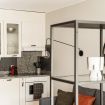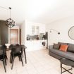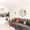 Located on the sixth floor and overlooking the city, this minimally furnished and modern studio apartment welcomes you with an open-space living room composed of the TV area and a sofa for watching a movie after a day of sightseeing, which turns into a double bed for the night (Please note: The sofa bed will not be prepared as a bed for your arrival, as we deem it proper to use it as a sofa during the day. You will find the bed linen, pillows and blankets in the wardrobe/shelf closest to the sofa.); next to it is the dining area with a table for 4 and a modern and complete kitchen, equipped with everything you need for preparing meals just like at home.