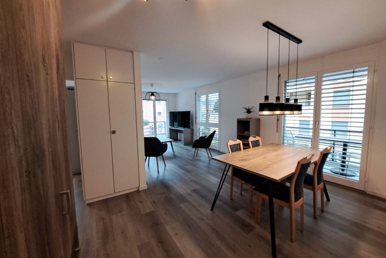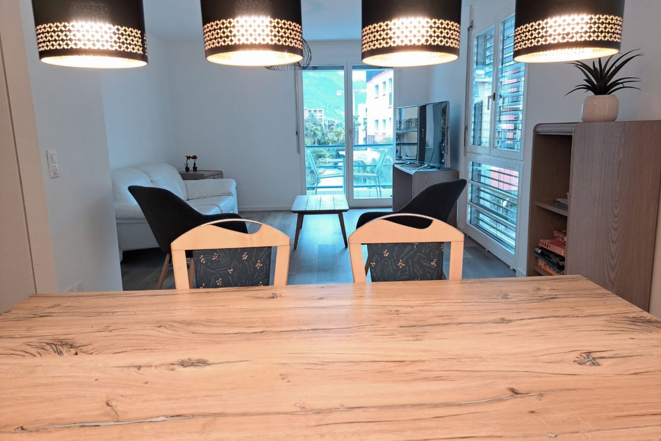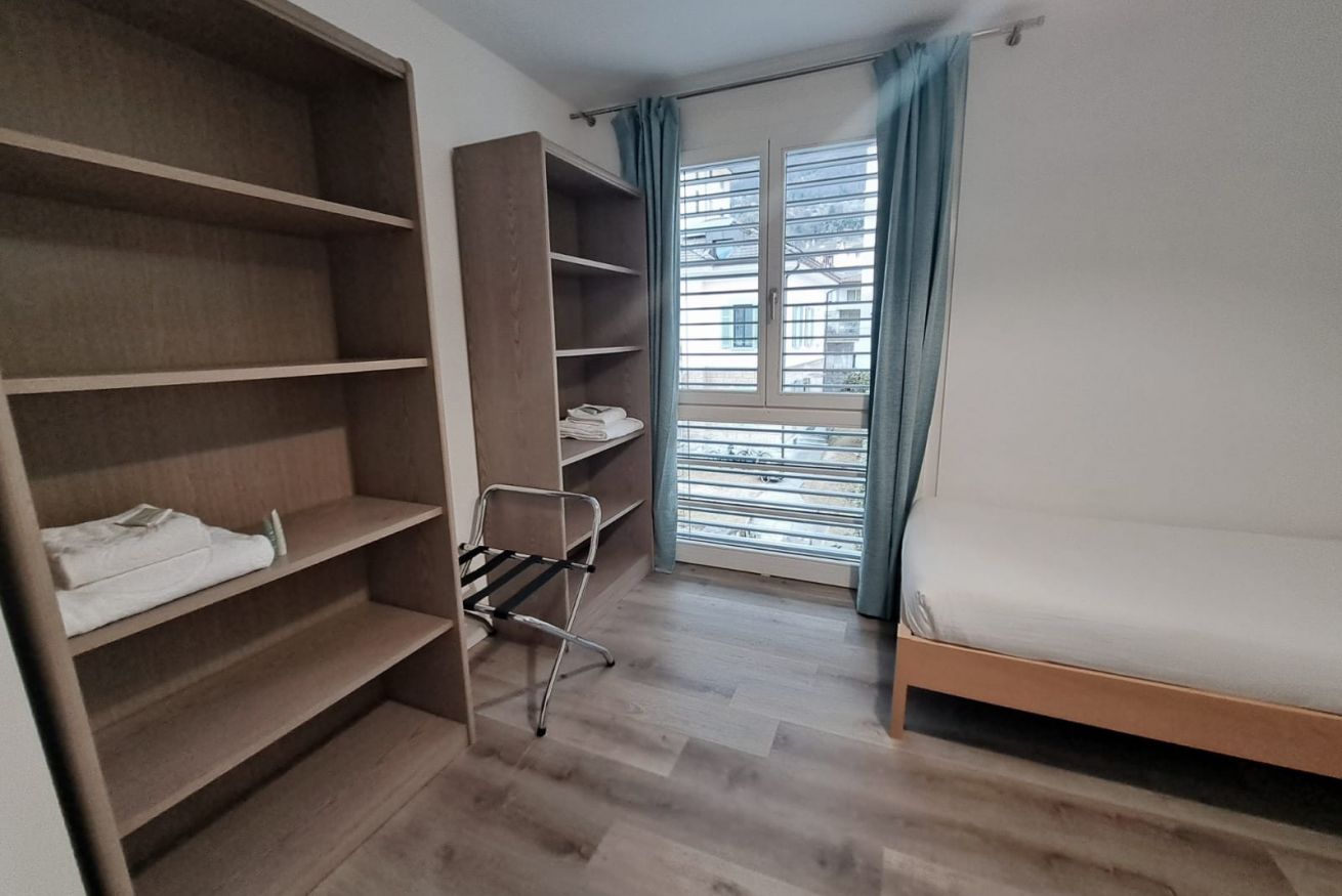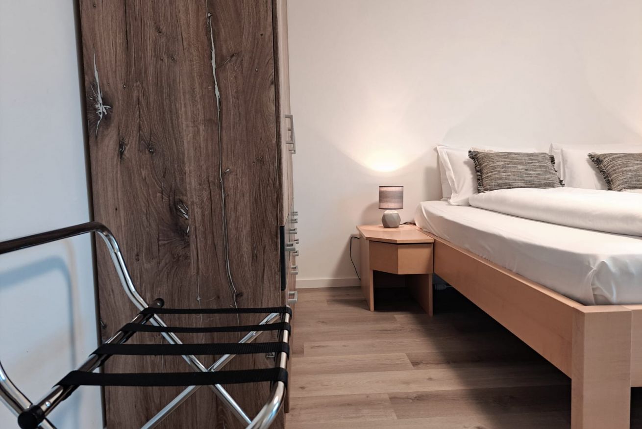 Situated on the second floor, the apartment welcomes guests into a spacious and bright living area with a dining table and a cozy relaxation corner featuring a sofa and TV, perfect for enjoying pleasant moments together. From here, there is access to two charming balconies offering a lovely view of the Ticino mountains. The separate kitchen, designed in white and neutral tones, is functional and fully equipped, providing everything needed to cook comfortably, just like at home. The sleeping area consists of two bedrooms: one double and one with two single beds, both furnished with large wardrobes and practical bedside tables, ideal for organizing your stay. Wooden floors and furnishings throughout the apartment create a warm and welcoming atmosphere, while the large windows further enhance the spaces, filling them with natural light and offering pleasant views of the surrounding greenery. The accommodation is completed by a modern bathroom with elegant marble-effect tiles and a shower.