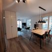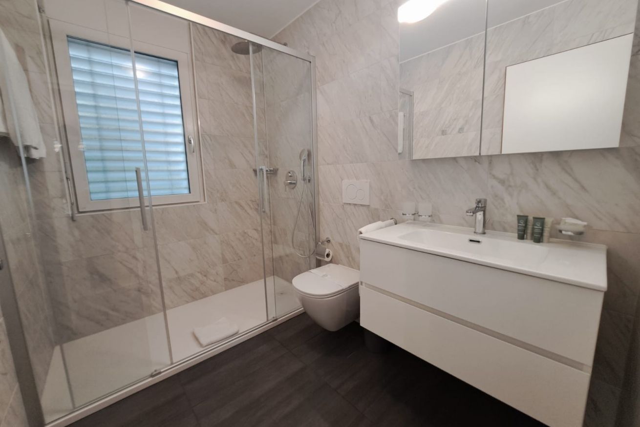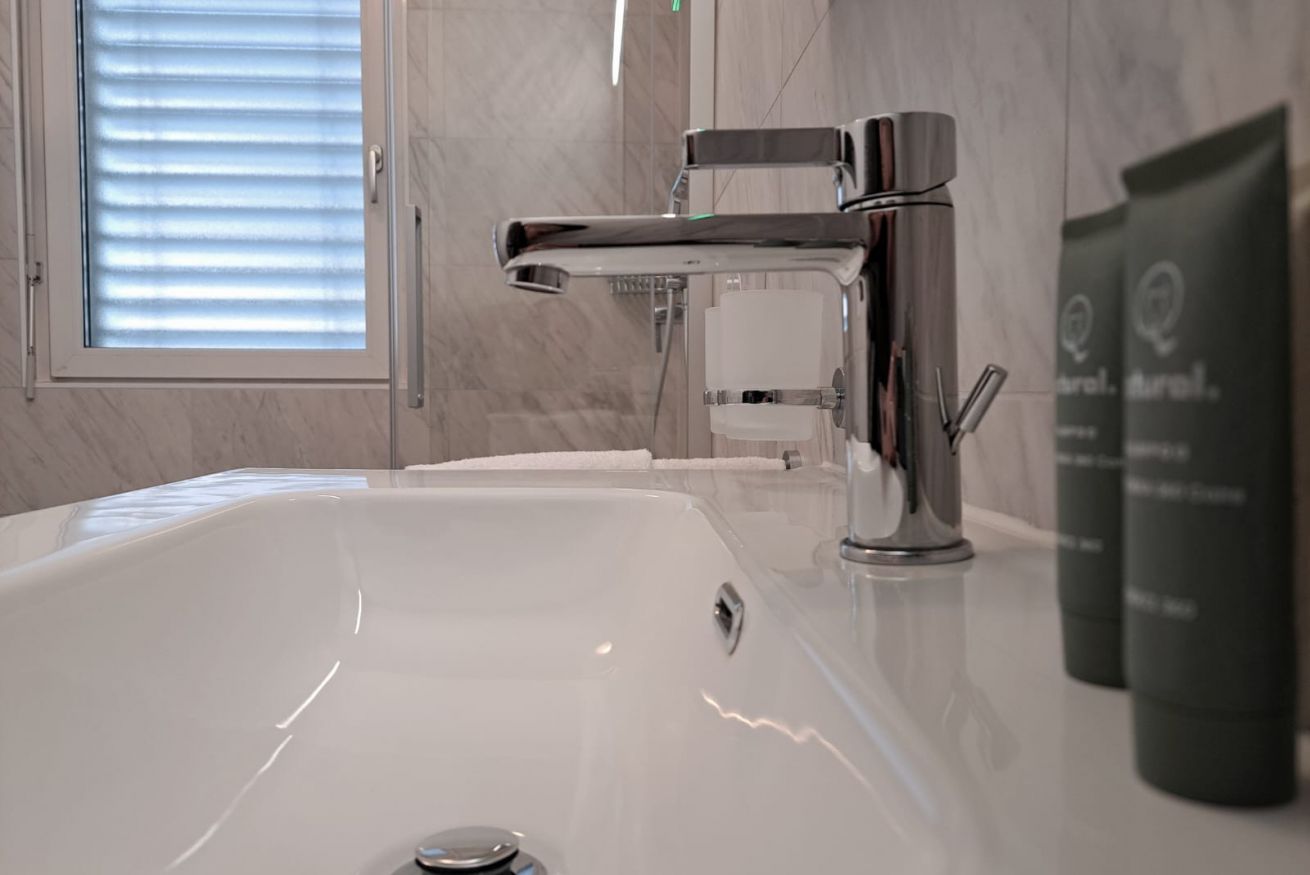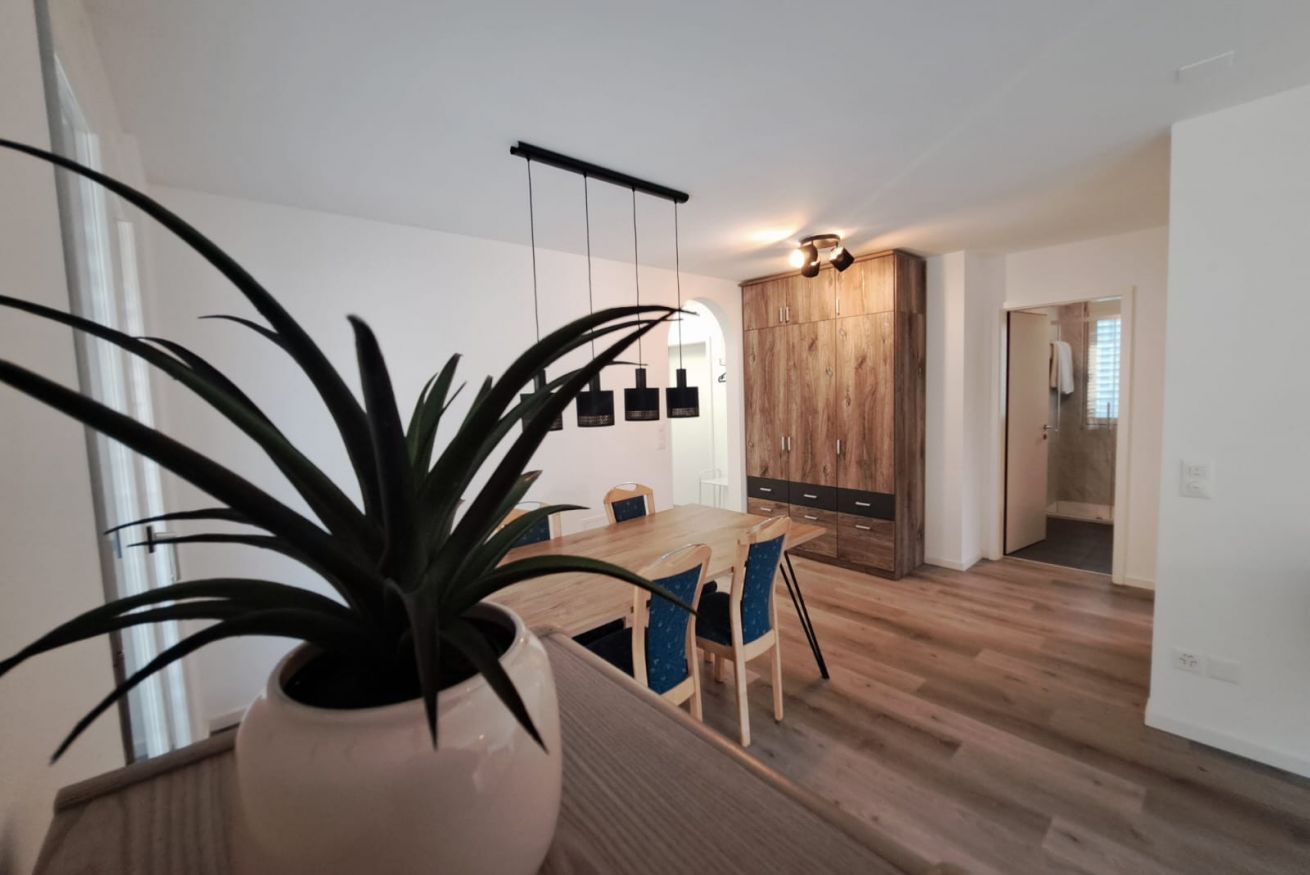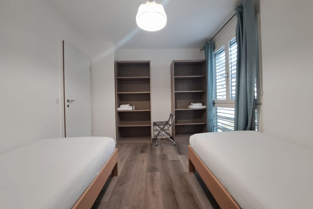 Situated on the second floor, the apartment welcomes guests into a spacious and bright living area with a dining table and a cozy relaxation corner featuring a sofa and TV, perfect for enjoying pleasant moments together. From here, there is access to two charming balconies offering a lovely view of the Ticino mountains. The separate kitchen, designed in white and neutral tones, is functional and fully equipped, providing everything needed to cook comfortably, just like at home. The sleeping area consists of two bedrooms: one double and one with two single beds, both furnished with large wardrobes and practical bedside tables, ideal for organizing your stay. Wooden floors and furnishings throughout the apartment create a warm and welcoming atmosphere, while the large windows further enhance the spaces, filling them with natural light and offering pleasant views of the surrounding greenery. The accommodation is completed by a modern bathroom with elegant marble-effect tiles and a shower.