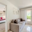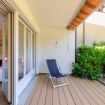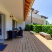 The bright and tastefully furnished living room features a relaxation area with a sofa and two comfortable armchairs, harmoniously integrated with the open-plan kitchen — modern and fully equipped — ideal for preparing meals to share around the practical wooden dining table. The sleeping area includes a double bedroom and a second bedroom with two single beds, both with spacious wardrobes, perfect for keeping clothes and accessories neatly organized. Large windows open onto a splendid private wooden terrace, surrounded by a lush green hedge that ensures privacy and peace. The apartment is completed by two spacious bathrooms, one with a bathtub and the other with a shower, designed to meet every need.