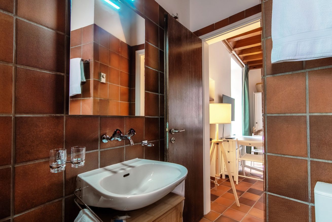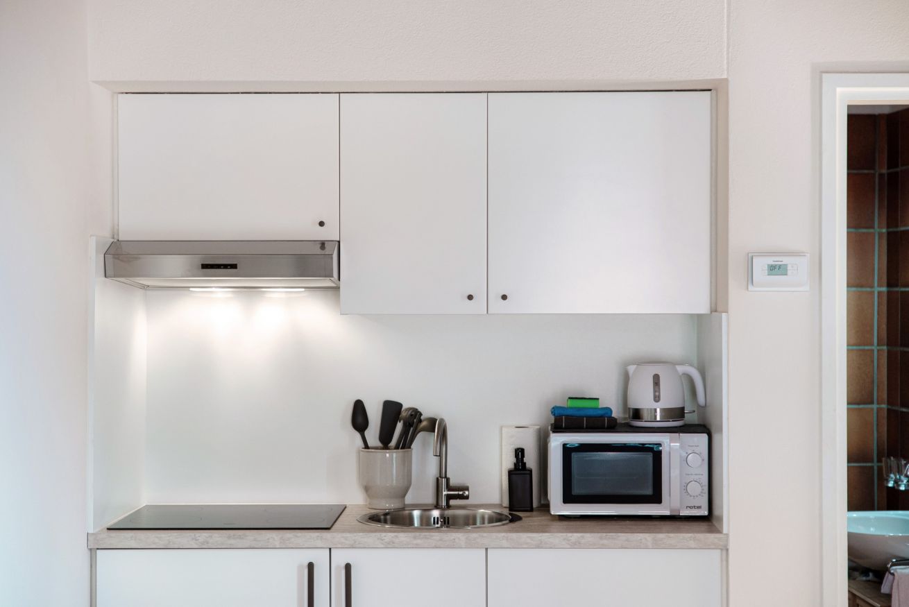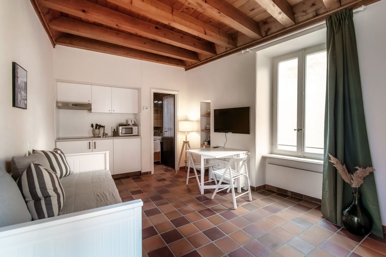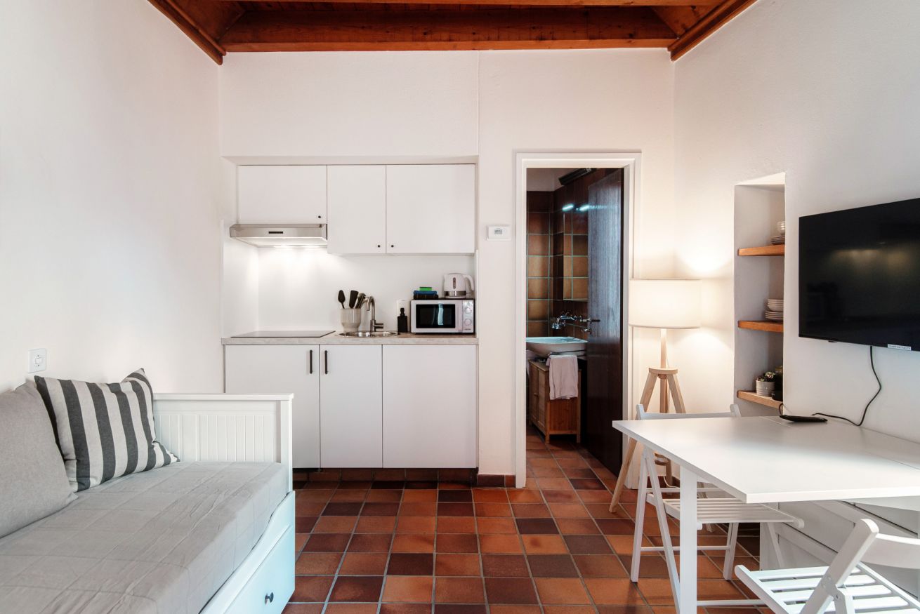 The living space is dominated by a comfortable sofa, which converts into a double bed for the night (Please note: The sofa bed will not be prepared as a bed for your arrival, as we deem it proper to use it as a sofa during the day. You will find the bed linen, pillows and blankets in the wardrobe/shelf closest to the sofa.), perfect for two people. You will also find a practical foldaway dining table, ideal for optimising space and accommodating up to three people for meals, with the possibility to use it as a desk for work or study.