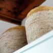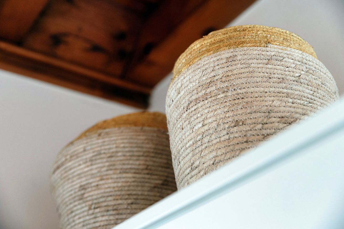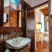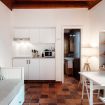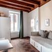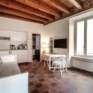 The distinctive feature of this apartment is the ceiling with exposed wooden beams, which lends a touch of rustic elegance to the room, creating a warm and cozy atmosphere.