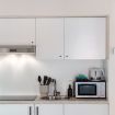 As soon as you enter, you are greeted by a bright and modern kitchen, featuring elegant white furniture and equipped with all the essential appliances to meet your daily needs. You will find a coffee machine, a kettle, an oven and a toaster.
