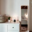 The bedroom is a large and bright space, dominated by a large white wooden double bed that offers a peaceful and comfortable nights' rest. A large window illuminates the room with natural light.