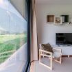 The space, bright and well-organized, ensures a practical and comfortable stay. The open-plan kitchen, fully equipped with modern appliances and kitchen utensils, is designed to meet all your needs. The dining table, placed next to the large French windows, offers a delightful view of the garden and mountains. The living area includes a comfortable sofa bed ideal for additional guests (Please note: the sofa bed is not prepared, we think it is proper to use the sofa during non-sleeping hours. You will find sheets, pillows and blankets in the closet/shelf most adjacent to the sofa.), a wooden armchair, and a smart TV.