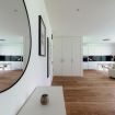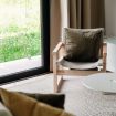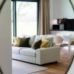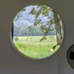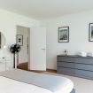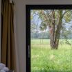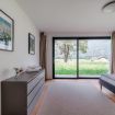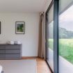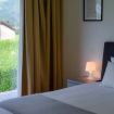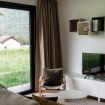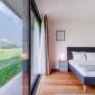The apartment features a stylishly decorated double bedroom, enhanced by a beautiful French door that opens onto the surrounding nature, offering a complete immersion in the landscape.