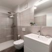 The bathroom, designed with a minimalist aesthetic, includes a spacious walk-in shower and modern fixtures.
