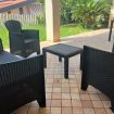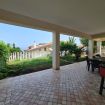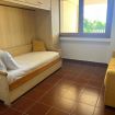 The living area includes a lounge with two comfortable sofas and a fully equipped kitchen. From here, you can directly access the outdoor area, featuring a large porch with a dining table and foosball table, perfect for enjoying social moments surrounded by the greenery of the private garden.