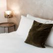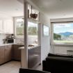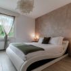 The apartment welcomes its guests into a warmly coloured living room, where the sun enters abundantly, creating a cosy atmosphere. The wooden table, with its rustic character but in perfect synergy with the modern and luxurious aesthetics, lends a touch of authenticity, while designer accessories embellish the space, adding a touch of originality. The generous window opens onto spectacular views, offering views of breathtaking sunsets that paint the sky in vibrant colours behind the great mountains of the Gulf of Lugano.