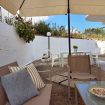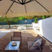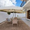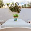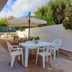 Outside, the apartment overlooks an area furnished with a large dining table and comfortable garden sofas, perfect for enjoying pleasant moments outdoors, surrounded by the quiet of nature and the scent of the sea.
