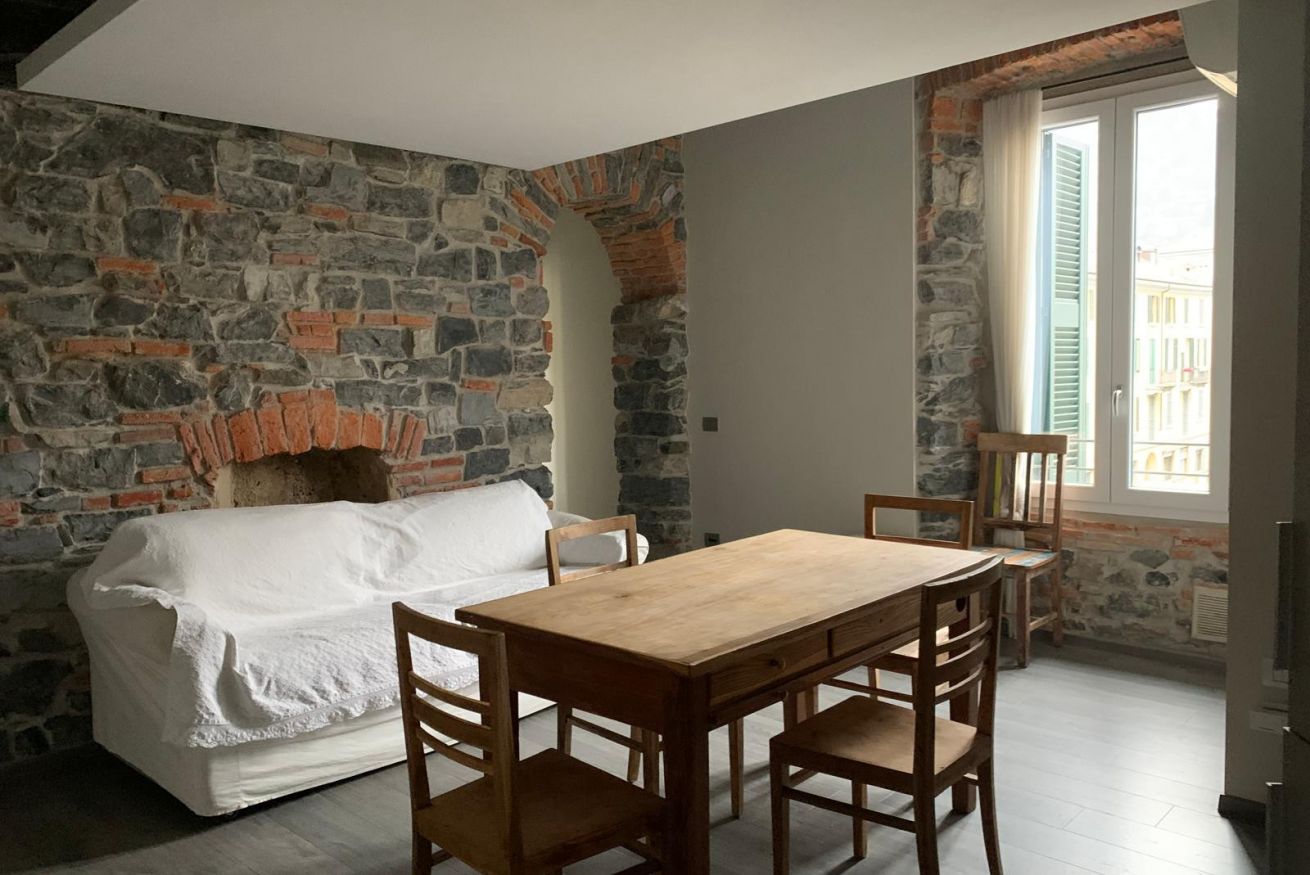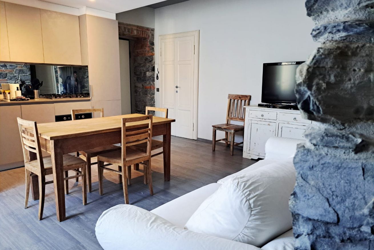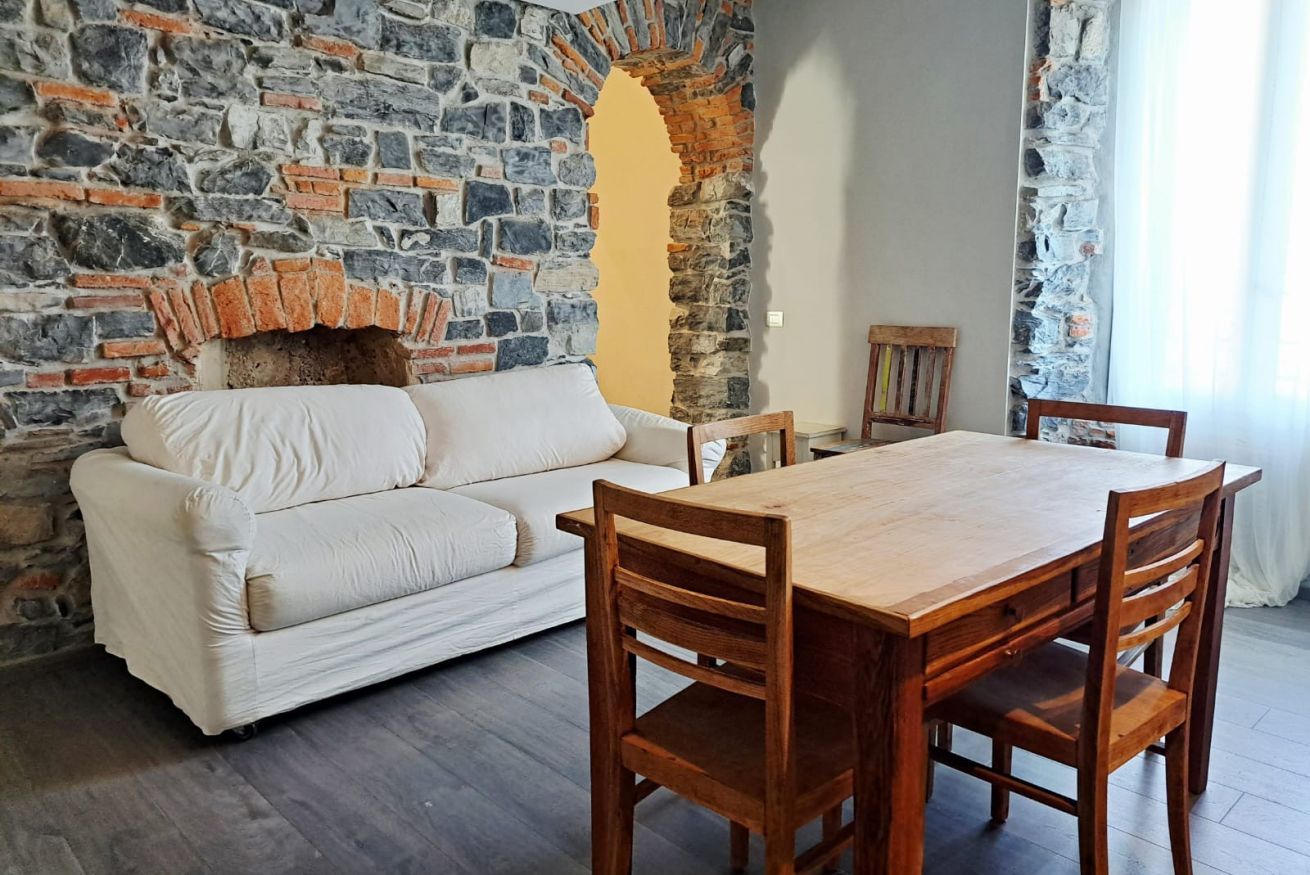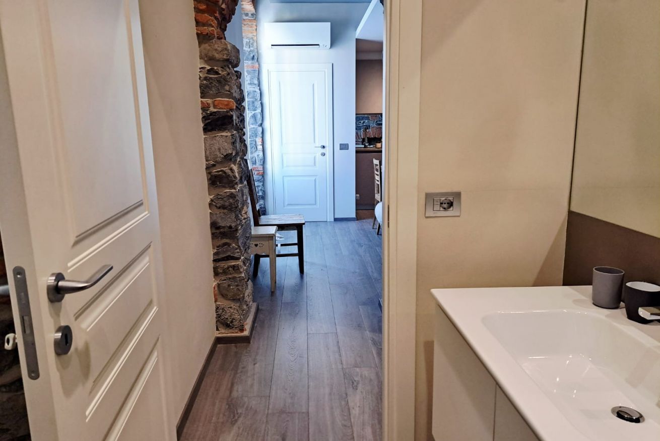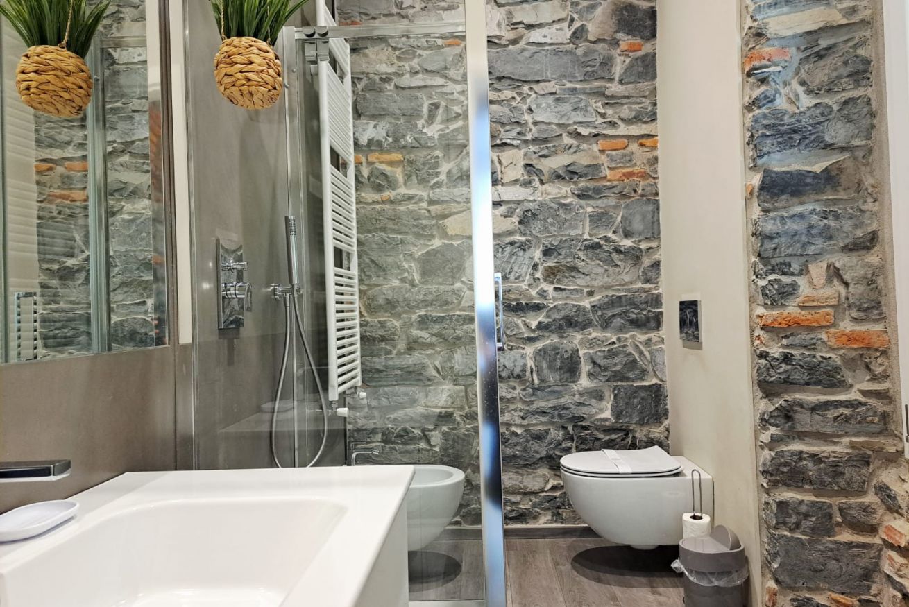 Located on the second floor, the apartment blends historic details with modern furnishings: exposed stone and brick walls harmonize with clean lines and light tones, creating a warm and welcoming environment. A perfect balance between old-world charm and contemporary comfort. Upon entering, you find the living area, with a modern open-plan kitchen and wooden dining table, accompanied by a double sofa bed and a TV cabinet—ideal for relaxing after a day exploring the lake and cobblestone streets. (Please note: the sofa bed is not set up for arrival, so you can use it freely during the day; sheets, pillows, and blankets are available in the wardrobe or nearby shelf). The bedroom, thoughtfully designed, features a comfortable double bed and a large wardrobe for easy organization. The apartment is completed by a spacious bathroom with a shower, featuring the same rustic details that make the property unique.