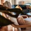 The living room opens up to the dining area, with a glass table for 4 for family dining. Next to it is the cosy corner with sofa, armchair and large TV, where you can watch a film or read a book.