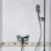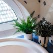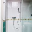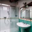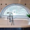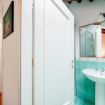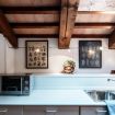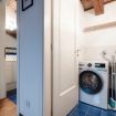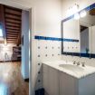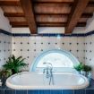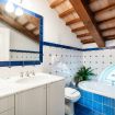 There are also two bathrooms, one with a shower and one, tiled in an intense blue, with a beautiful bathtub that offers a wonderful view of the greenery surrounding the village.