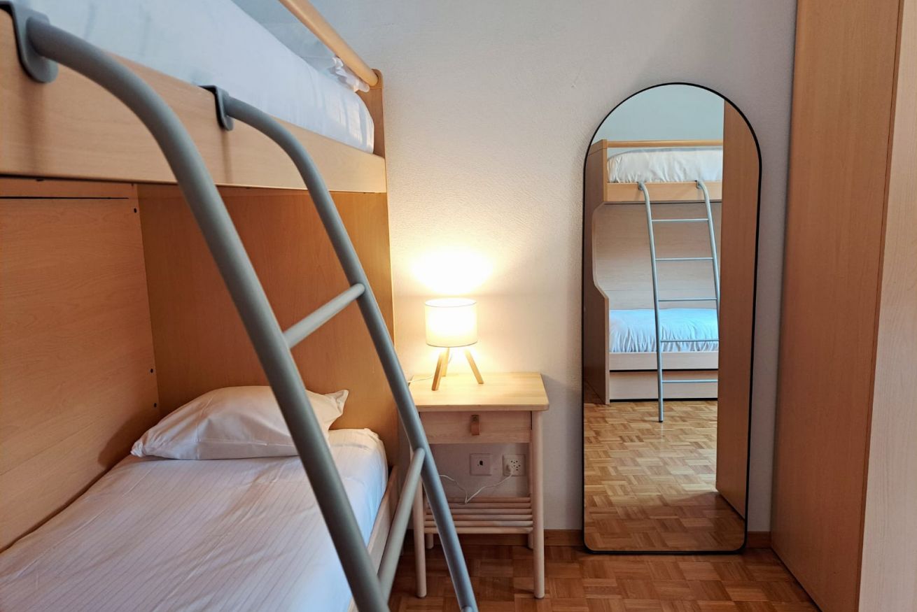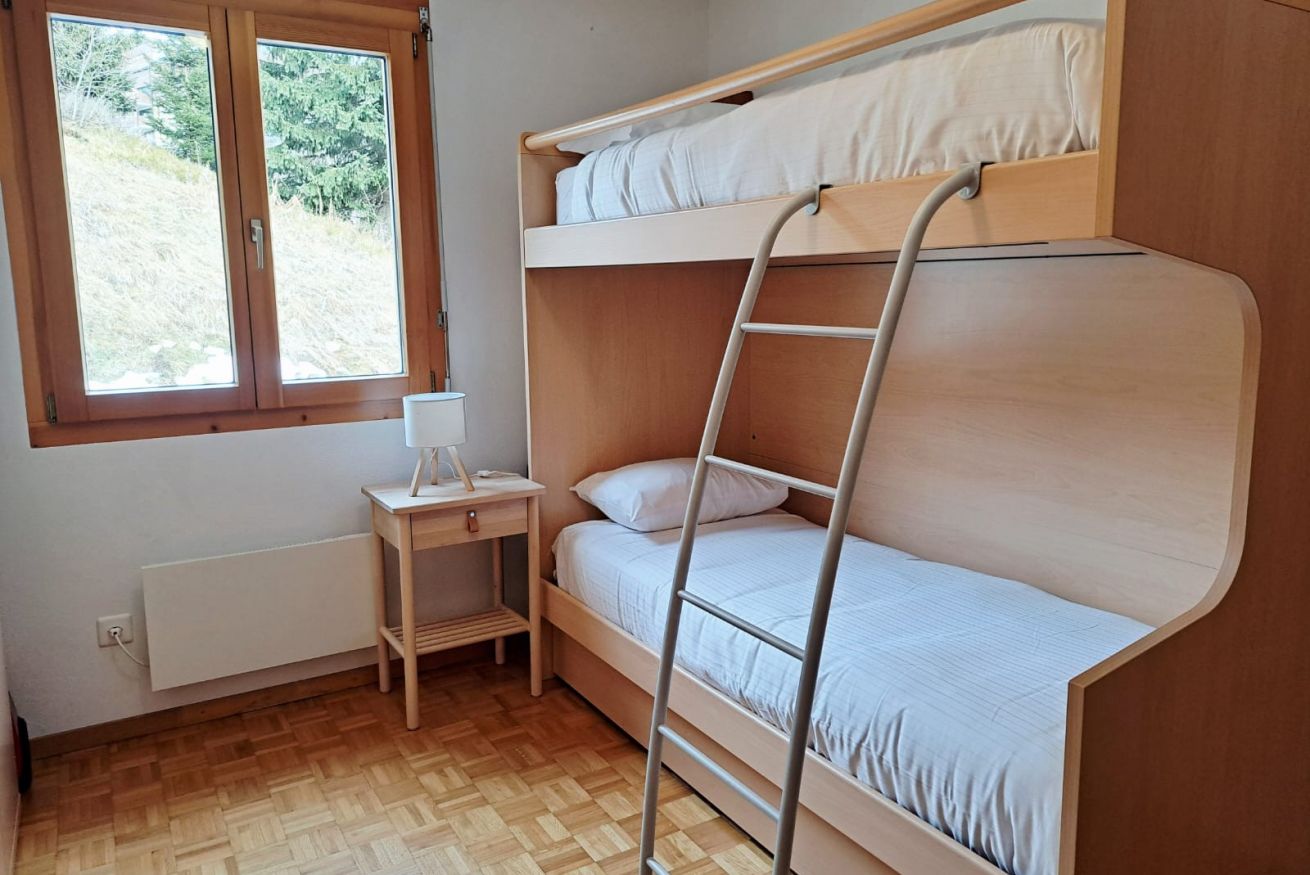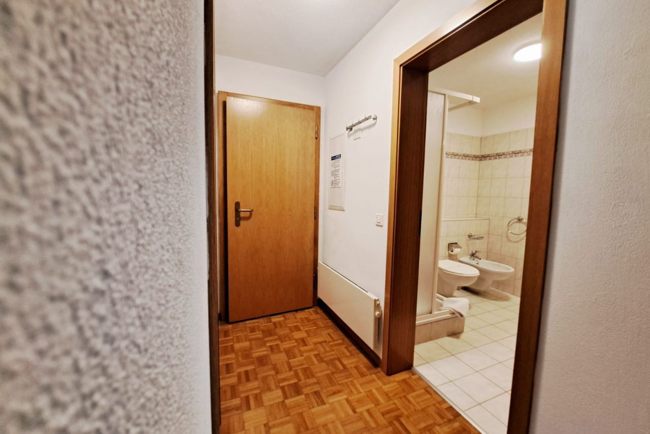 Located on the first floor, it welcomes guests with a small hallway that leads to the bright living area, harmoniously divided between a fully equipped kitchen and a cozy corner with a sofa and TV. The kitchen peninsula, which also serves as a dining table for four, creates an elegant and functional balance between the spaces. A large French door opens onto the private balcony, a true quiet corner where you can be enchanted by the view: snowy mountains in winter, lush forests and Alpine scents in summer. The sleeping area includes a double bedroom and a second bedroom with a bunk bed, perfect for families or small groups of friends. The parquet floors and wooden furnishings envelop the spaces in a warm and authentic atmosphere, turning the apartment into a welcoming retreat after a day of outdoor exploration. A simple and classic-style bathroom with a shower completes the apartment.
