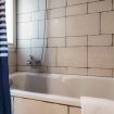 A bathroom with a bathtub concludes the apartment.