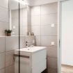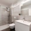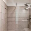 The bathroom, designed with a minimalist aesthetic, includes a spacious walk-in shower and modern fixtures.
