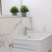 Finally, the bathroom, in elegant marble style, is equipped with a bidet and a spacious shower.