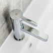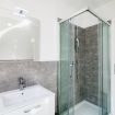 The bathroom is spacious and modern, with a shower.