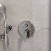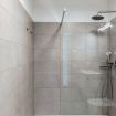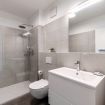 The bathroom, designed with a minimalist aesthetic, includes a spacious walk-in shower and modern fixtures.