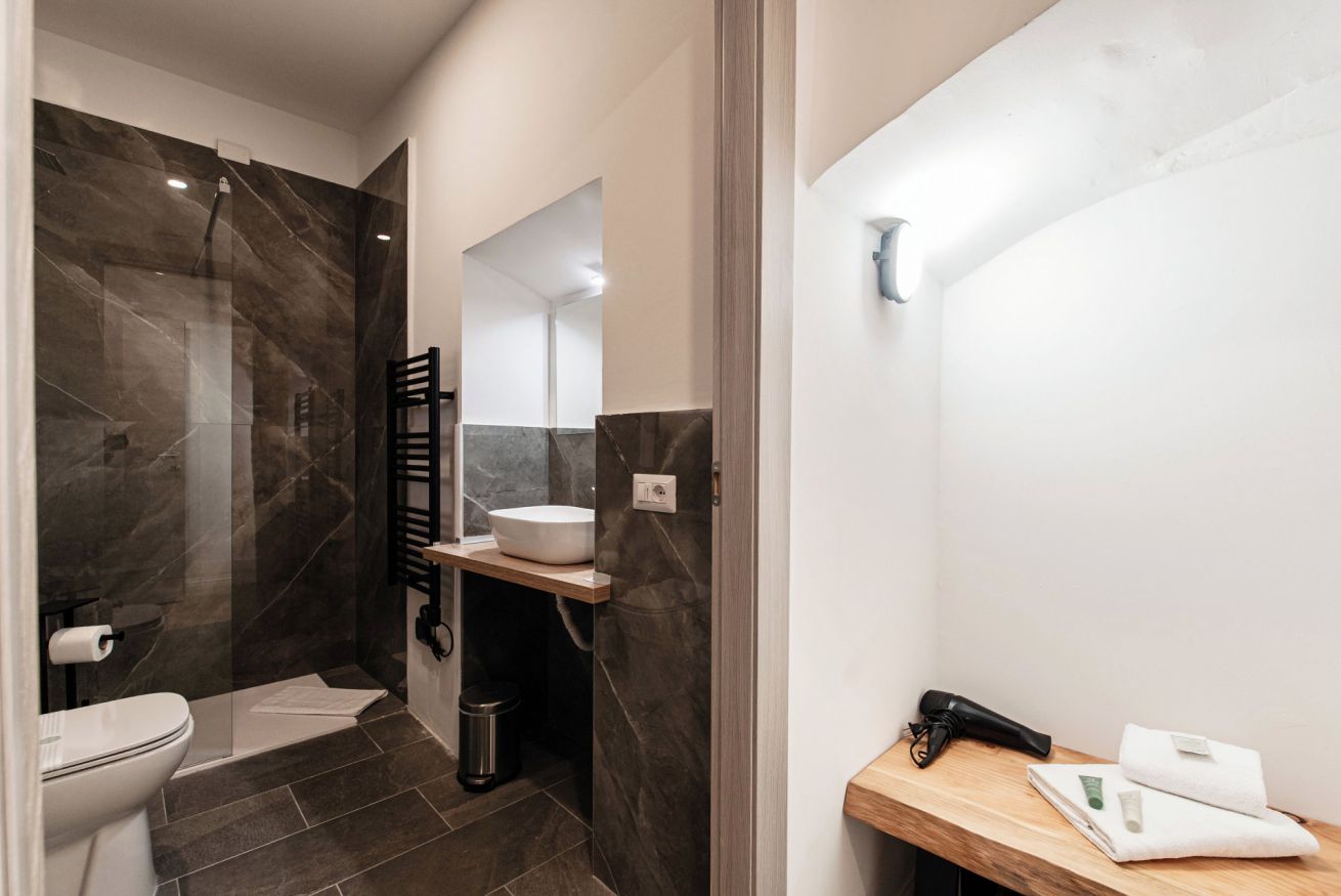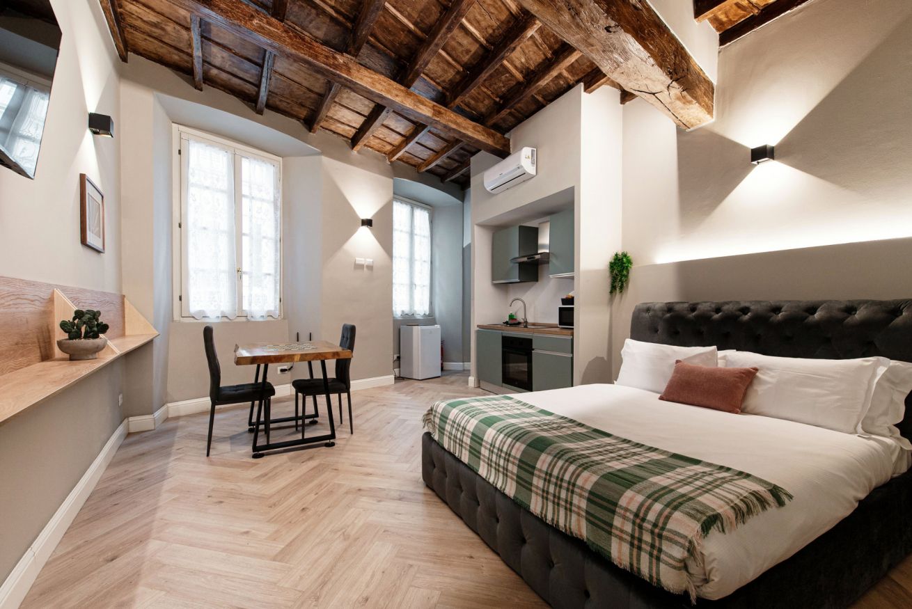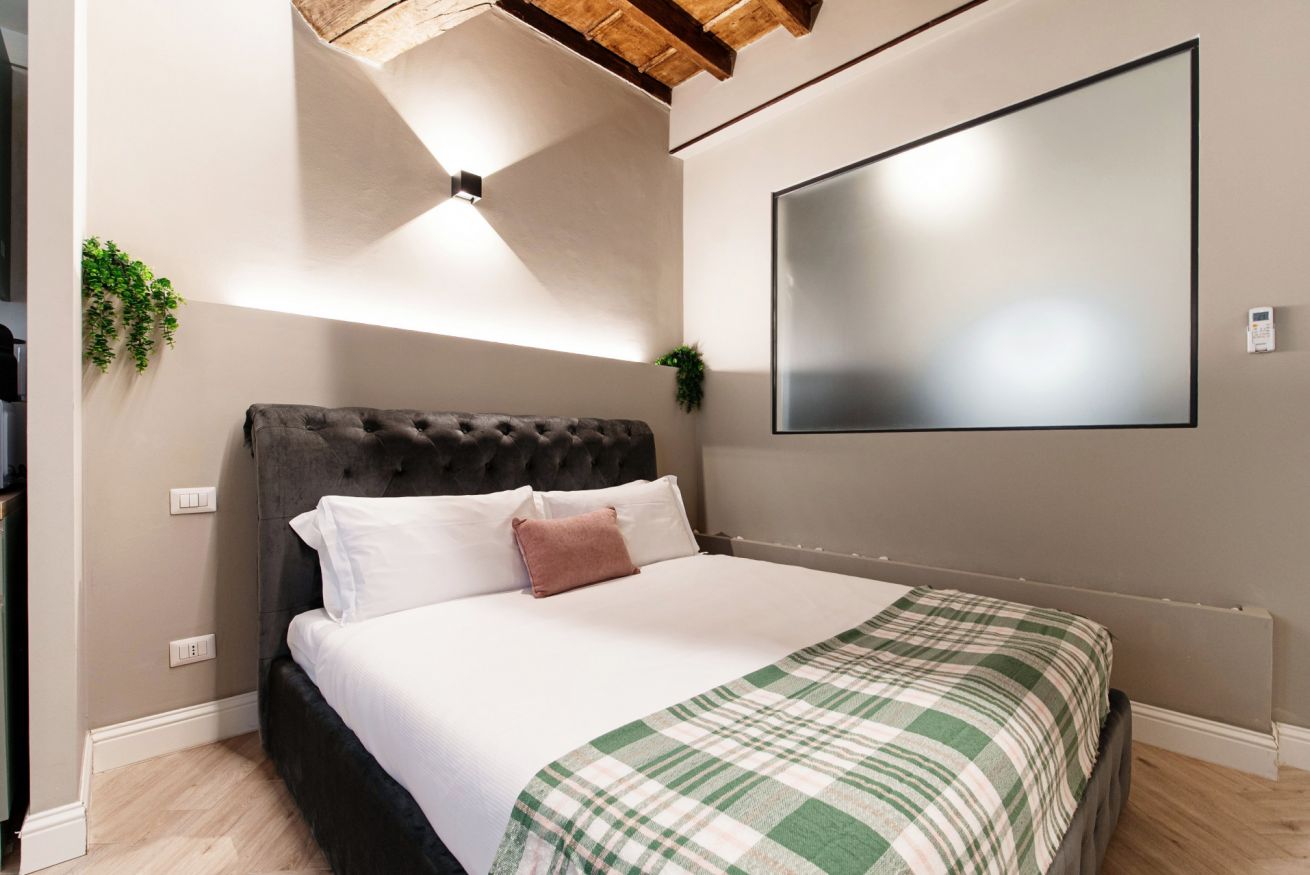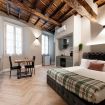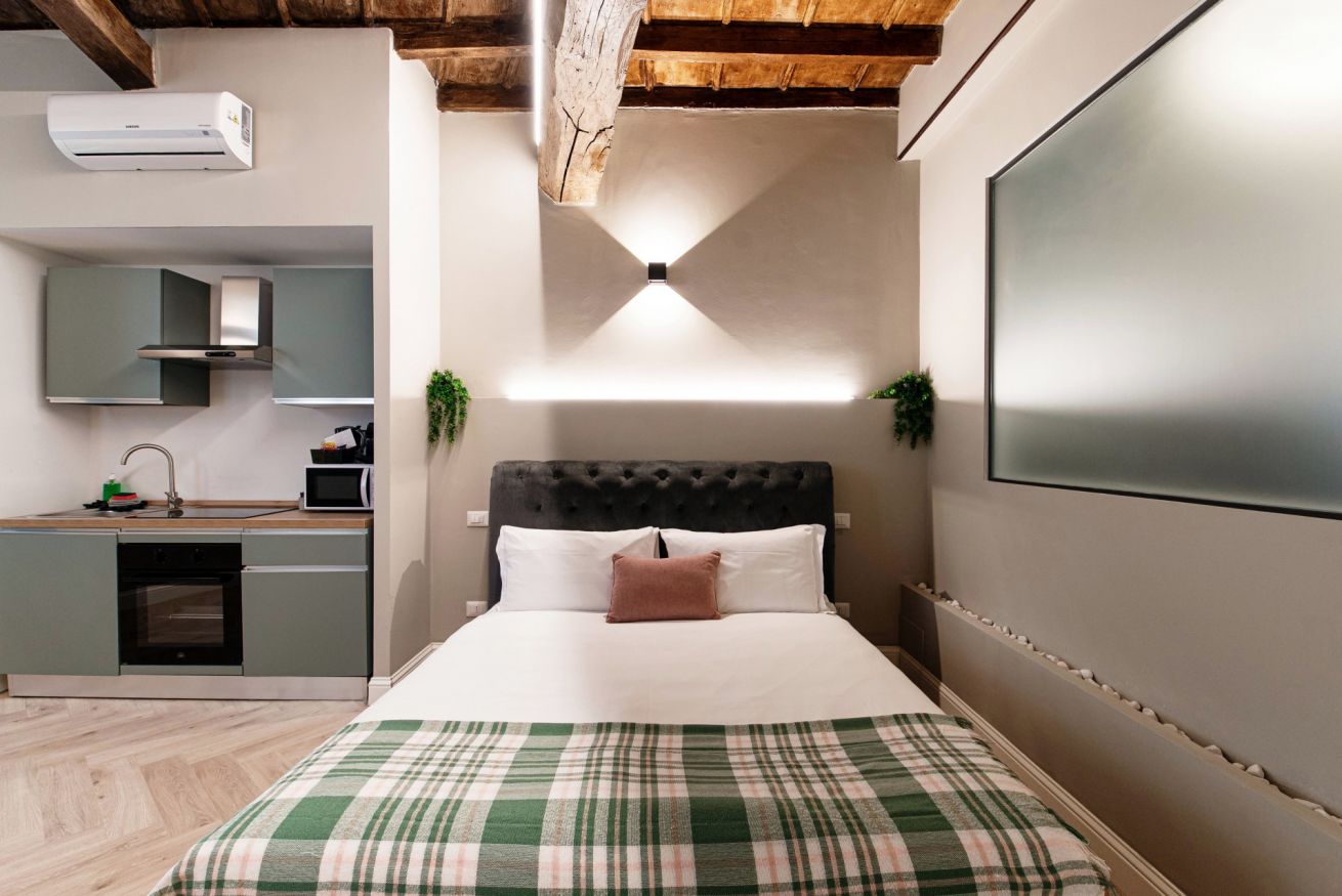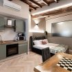 The spacious open-plan layout harmoniously combines the living area—featuring a modern, fully equipped kitchen that allows you to enjoy the city without giving up the comforts of home—with the sleeping area, enhanced by a double bed with a soft velvet headboard. Warm-toned finishes, herringbone parquet flooring, and contemporary furnishings create a refined yet welcoming atmosphere, ideal for a comfortable stay just steps away from the city’s main attractions. Completing the apartment is an elegant bathroom with stone-effect tiles and a large walk-in shower.